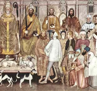 � San Domenico presiede un tribunale dell'Inquisizione (olio di P. Berruguete, XV sec.). L'ordine dei domenicani fu fondato dal religioso spagnolo Domenico Guzman nel 1215, con il preciso scopo di combattere l'eresia albigese. Circa vent'anni dopo i domenicani ebbero l'incarico dell'inquisizione per l'Italia, la Spagna e il Portogallo. � |