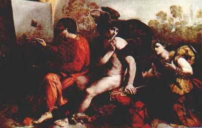 Non sempre il rapporto con le fonti� dei Sabei � confermabile anche per realizzazioni di et� medievale e comunque questa influenza va del tutto scemandosi nei periodi successivi. Il Saturno rappresentato sul campanile di Santa Maria del Fiore, che divora un bambino, riprende l�immagine dell�Ovide moralis� nelle illustrazioni dell�introduzione di Bersuir (43), mentre le illustrazioni del Agiaib al-makluqat di al- Qaswini a p. 1336, lo presentano come un fachiro, poich� astrologicamente Saturno presiede le terre dell�India, con la bilancia che sormonta la sua figura. Saturno ha in effetti� nel segno della Bilancia la sua esaltazione, come pure indicano le illustrazioni di un altro testo arabo, l��Introductio in astrologium, nella traduzione di Zotori Zappari risalente alla met� del XIII secolo. Il tema della bilancia di fatto sar� ripreso da Durer nella sua celebre incisione la Malinconia del 1514. Ancora alla versione antropofaga del dio della settima sfera, se ne affiancarono in seguito altre come quella di Saturno fondatore di Sutri con l�aspetto di un guerriero, con un fascio di spighe di grano nella mano, simbolo questo, che in taluni casi appartiene piuttosto a Giove, come rivela il bassorilievo di Agostino di Duccio nel Tempio Malatestiano. Curiosa � l�esecuzione del Campagnola di un Saturno rappresentato come dio fluviale con un riferimento al dio dell�Arco Traianeo a Benevento.� Anche la sua forma pi� classica, quella cio� precedente alla sua identificazione con il Cronos greco, munito come dio agreste di falce fienaria, ha una sua evoluzione dalle illustrazioni dei manoscritti di Rabano Mauro al Saturno agricolo del Mocetto. A parte questa identit� mitica di Saturno che trova impiego nelle sue raffigurazioni, la divinit� astrale si ricopre funzionalmente anche di valori filosofici. Il neoplatonismo esalta Saturno come la mente cosmica legata da una parte con Dio (Urano), dall�altra con l�anima cosmica (Giove). Questa concezione fa svolgere iconograficamente a Saturno il ruolo di denudare la verit� dai giochi illusionistici dell�apparenza come riveliamo nell�Impudicizia svelata del Bronzino.